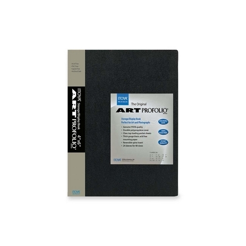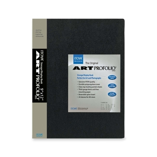 "Itoya of America, Ltd Art Portfolio, Top Load, 24 Sleeves, 9""x12"",BlackArt storage/display book is great for storing and displaying photographs and film. 24 top-loading, clear polypropylene sleeves will not stick to copier toner. Reversible spine insert...