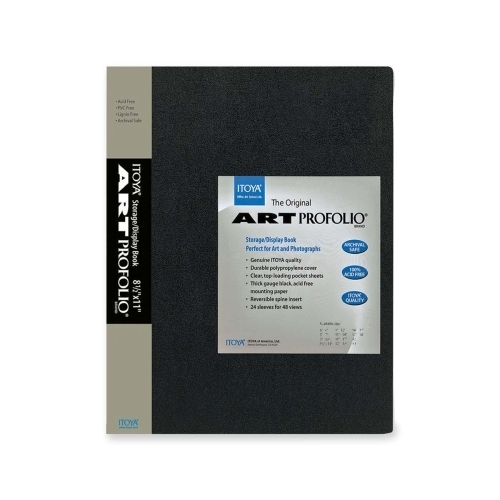 "Itoya of America, Ltd Art Portfolio, Top Load, 24 Sleeves, 11""x14"", BlackArt storage/display book is great for storing and displaying photographs and film. 24 top-loading, clear polypropylene sleeves will not stick to copier toner. Reversible spine insert allows you to customize your title and organization with these bulk wholesale cheap discount art portfolio folders. Durable polypropylene construction of pages and cover is PVC-free and acid-free. Each page includes black mounting paper that is acid-free. Art book is archival safe for all your art storage needs."