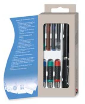 Calligraphy mini kit includes one Viewpoint calligraphy pen with three nibs (fine, medium, broad) and four assorted colour Skrip ink cartridges (blue, black, red, yellow) for the art of fine lettering. Elegant, quill-style, tapered Viewpoint pen features...